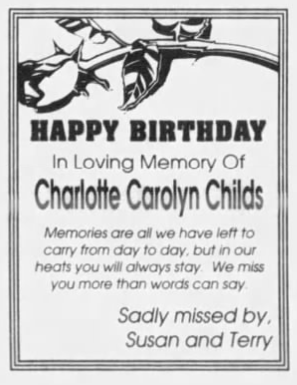 https://www.newspapers.com/image/345701705/?terms=charlotte%20childs&match=1 & https://www.newspapers.com/image/345701732/?terms=charlotte%20childs&match=1